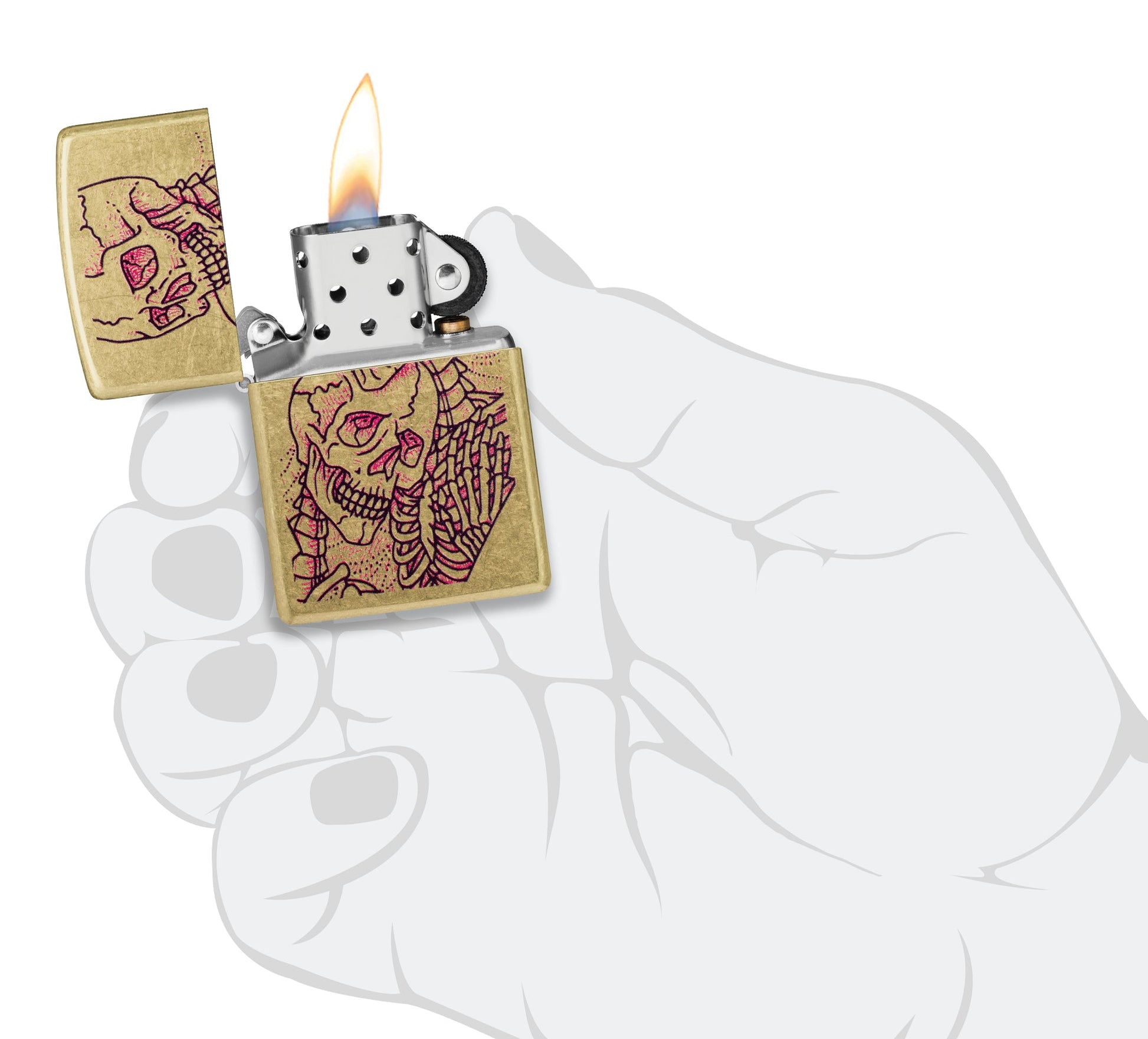 Proving that love endures even long after death, a pair of skeletal lovers shares an embrace on this classic Street Brass lighter in a romantic Color Image design. Comes packaged in a gift box. For optimal performance fill with Zippo lighter fuel.