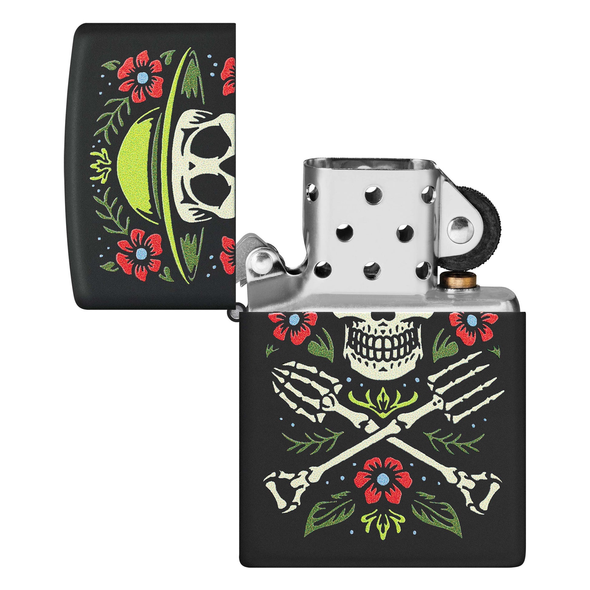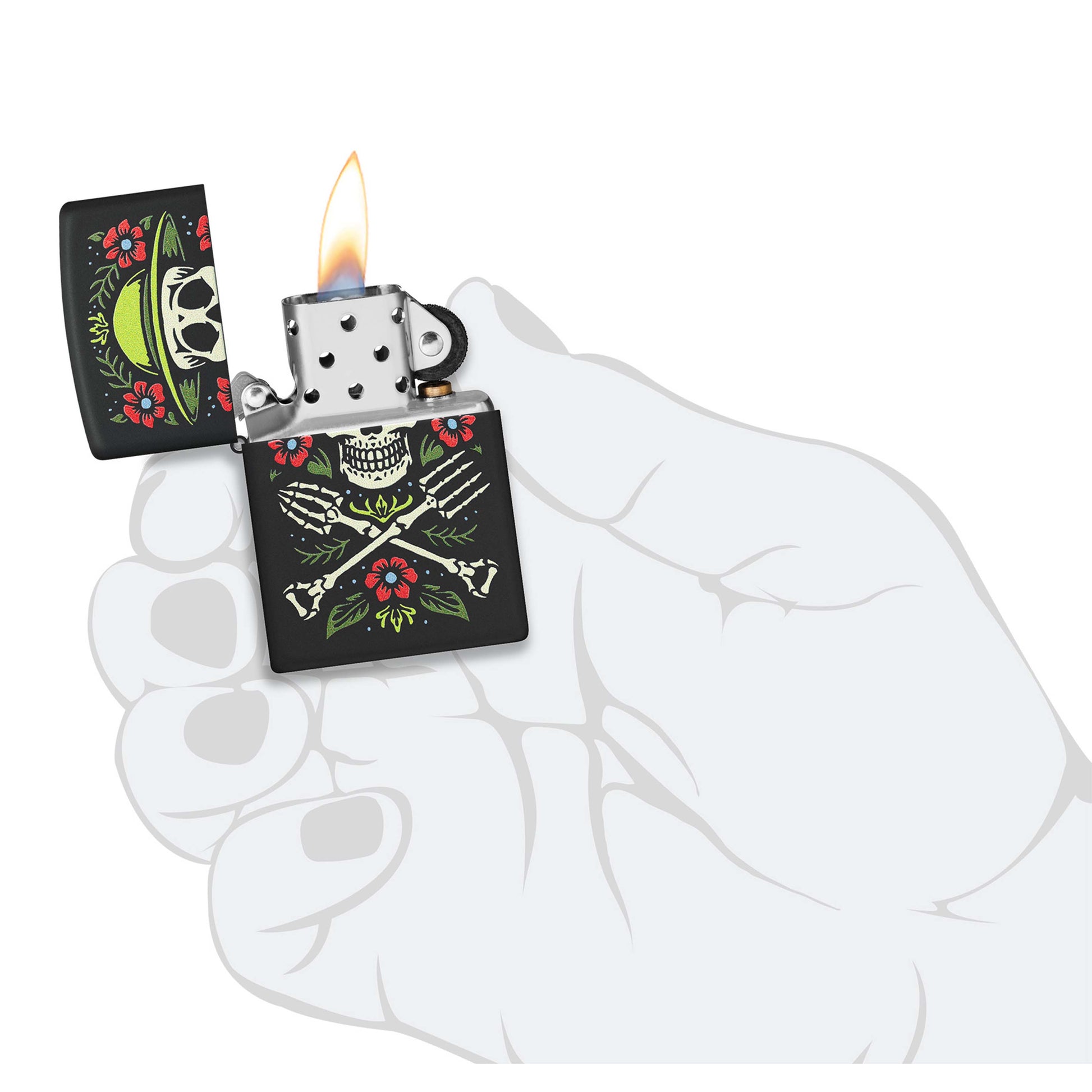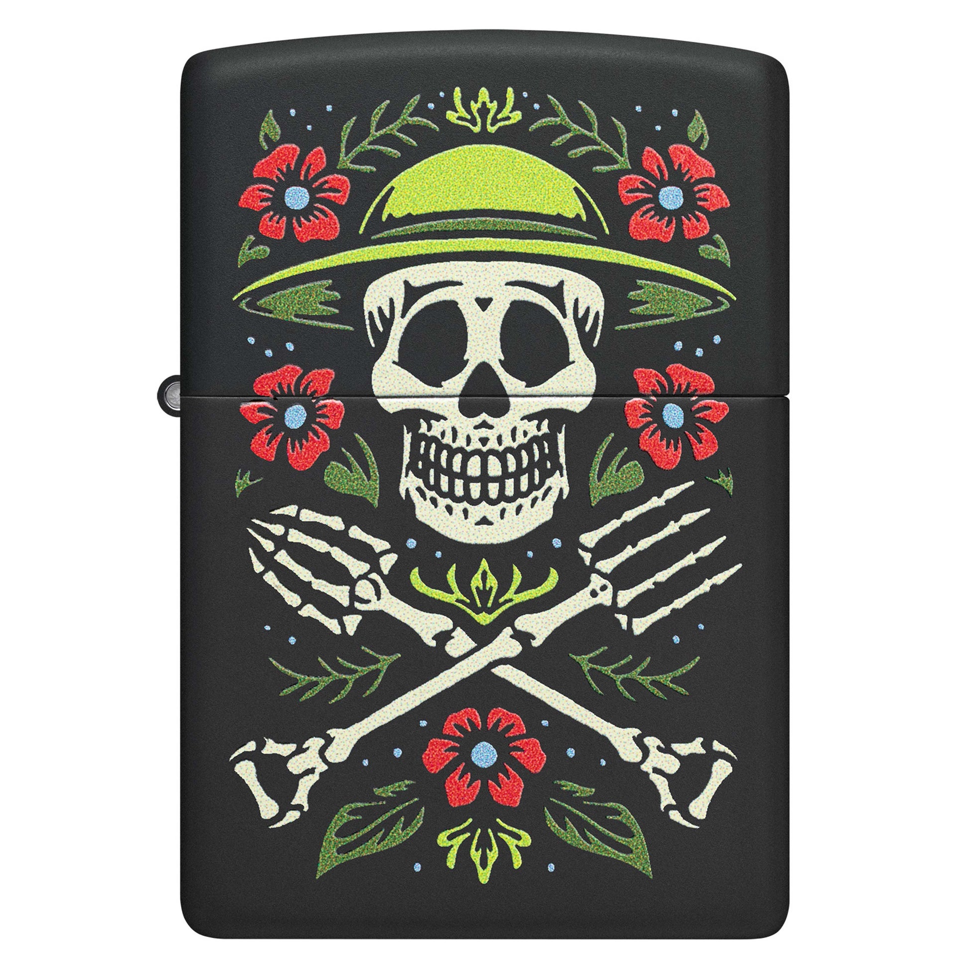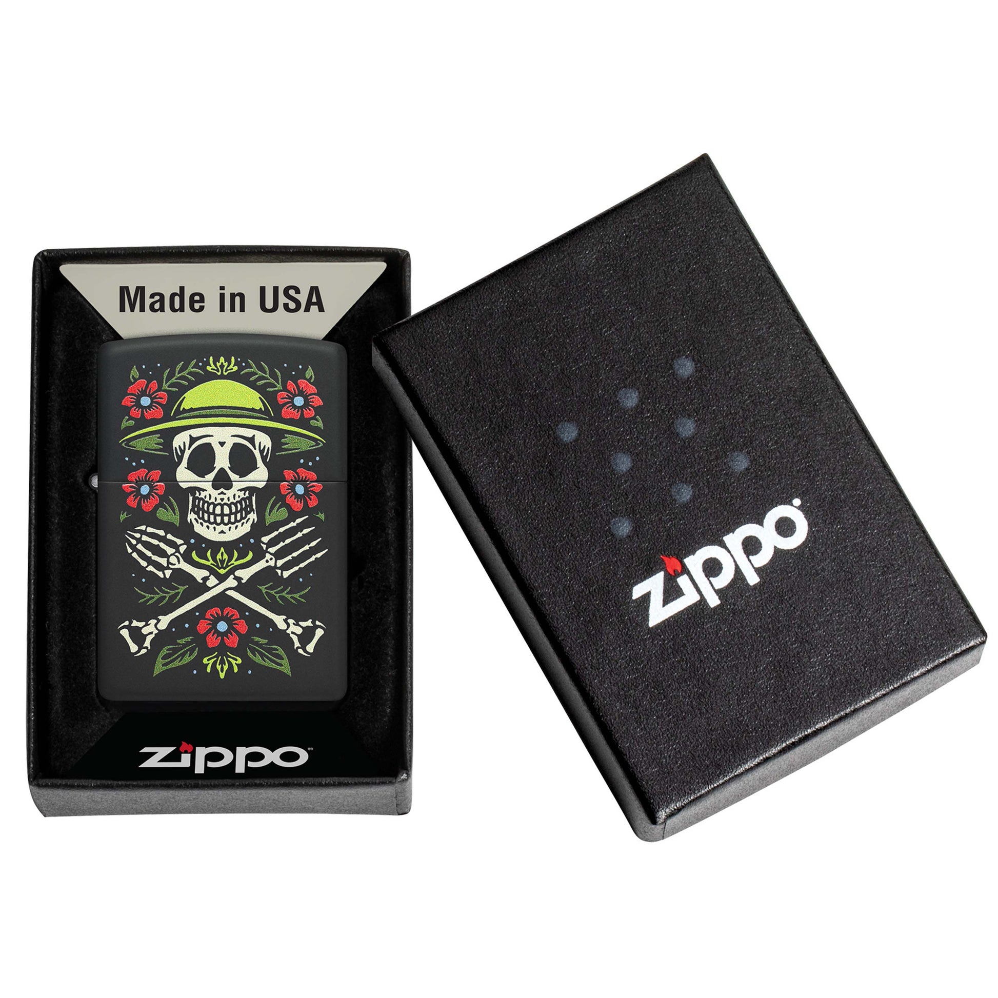 Perfect for any lifelong gardener, this classic Black Matte lighter features a cheerful twist on the skull and crossbones. Surrounded by a bright crop of flowers, a skeletal gardener is flanked by garden tools in the vibrant Color Image design. Comes packaged in a gift box. For optimal performance fill with Zippo lighter fuel.