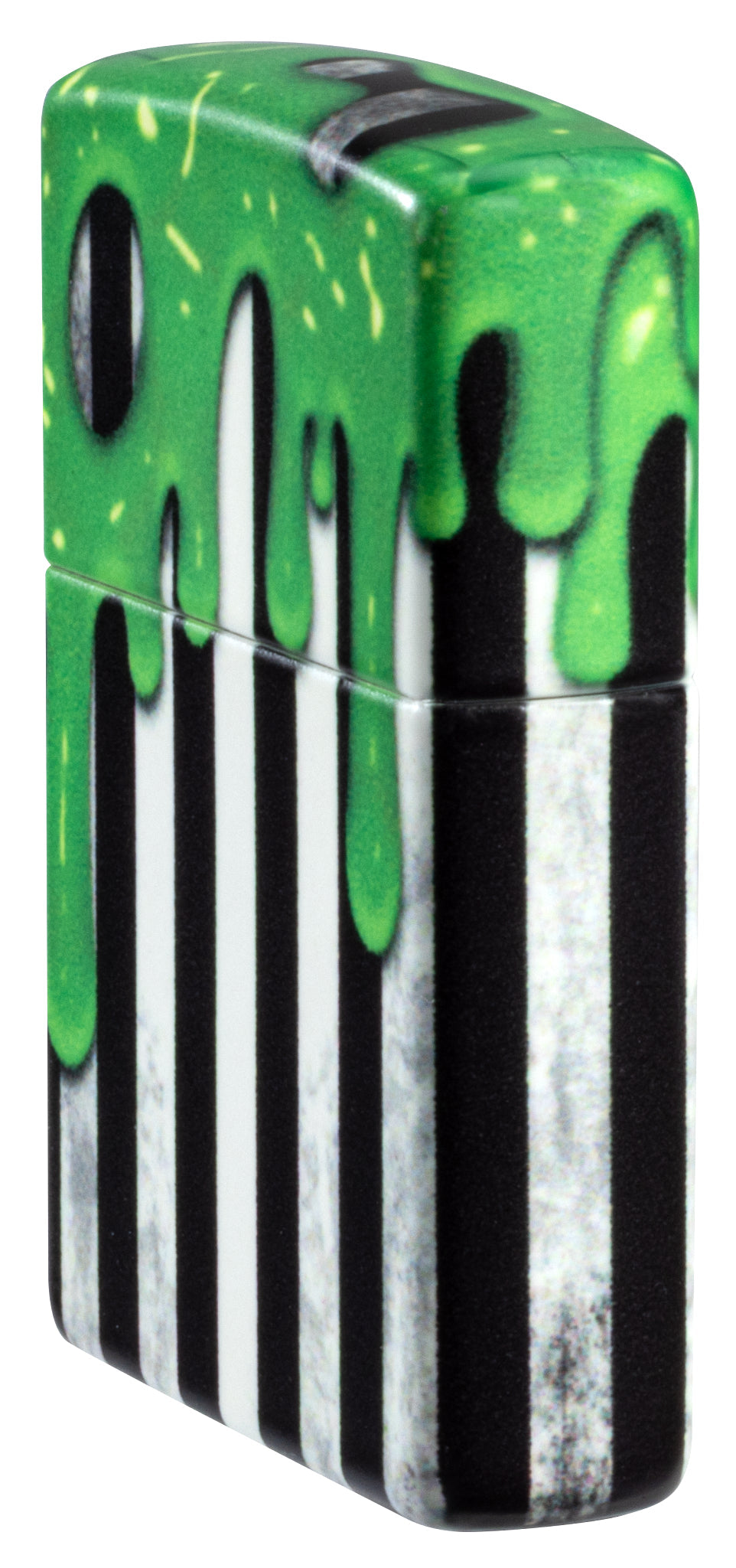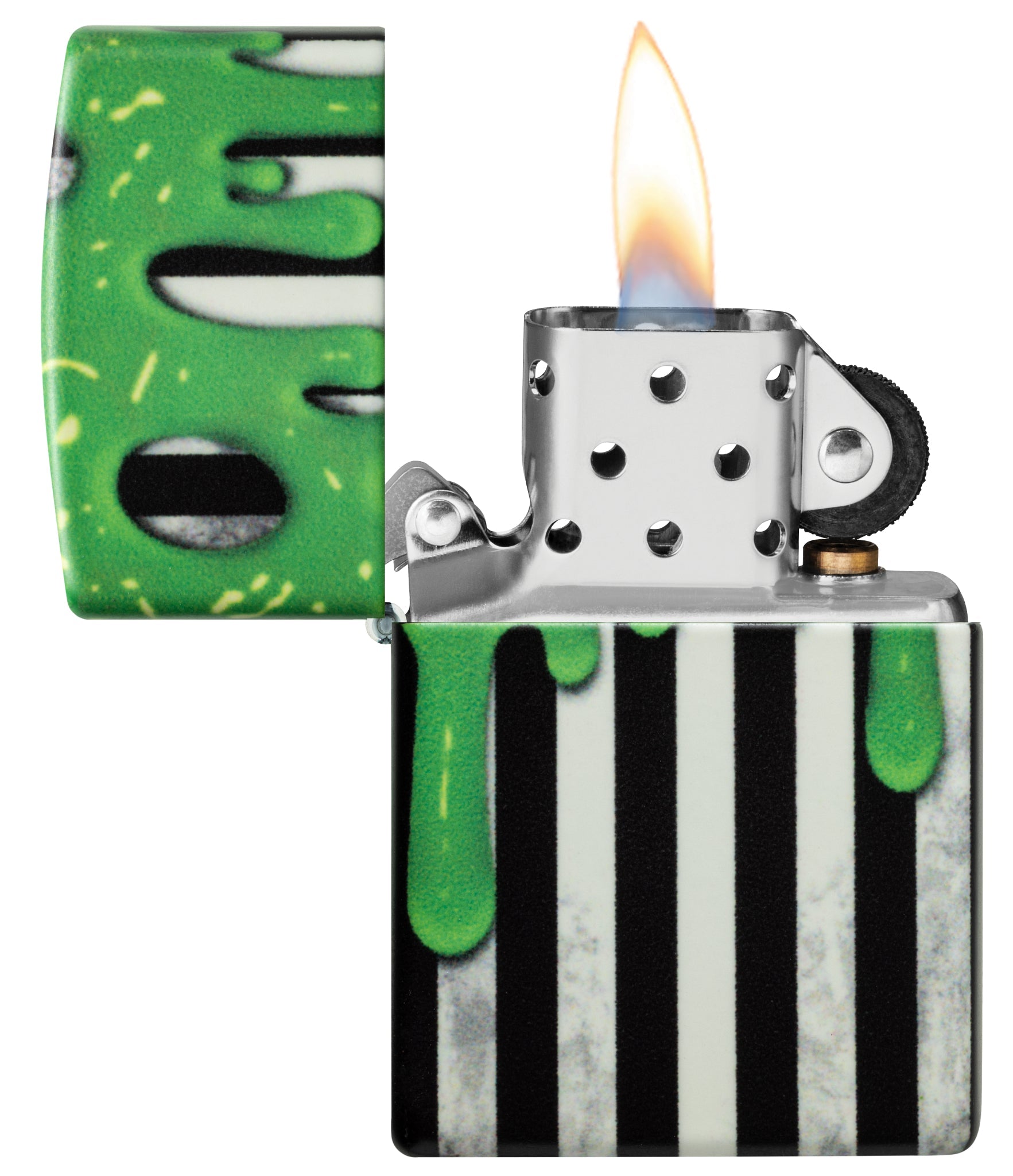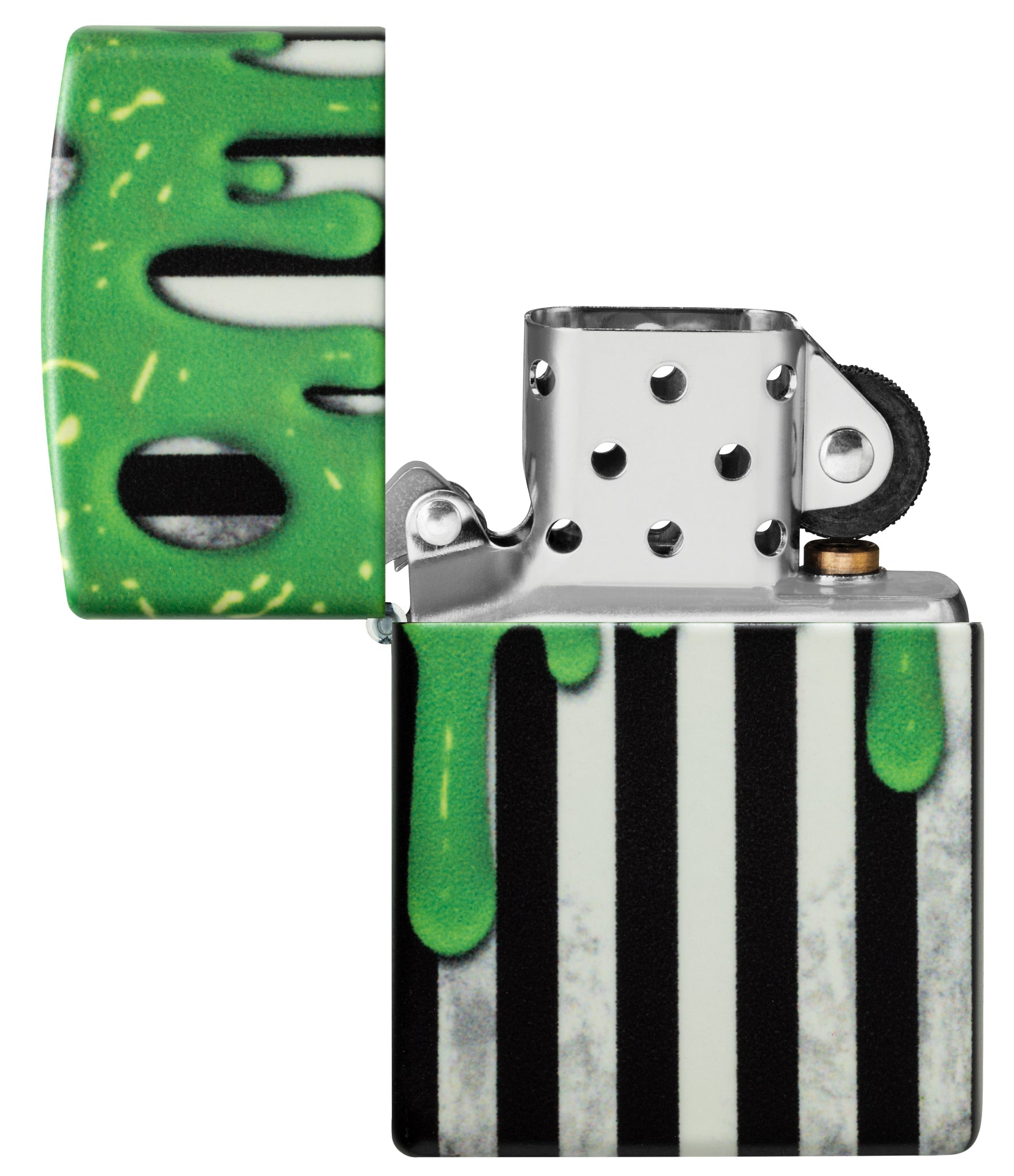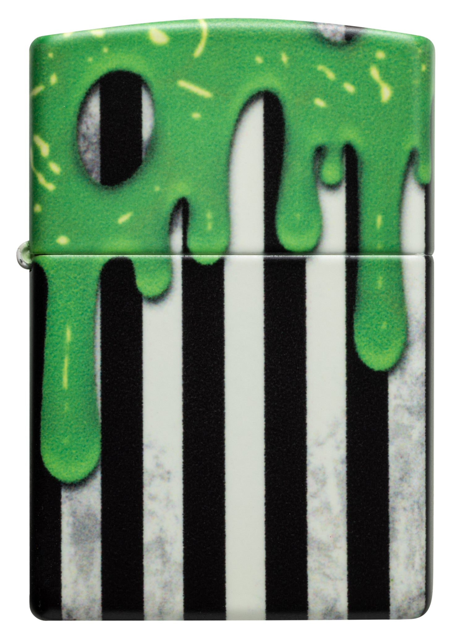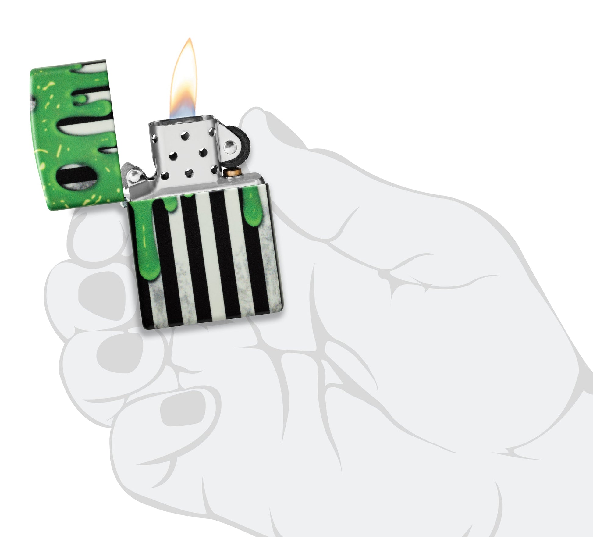Sticky green goo oozes over black stripes on all sides of this classic 540 Color in a seamless, all-over design, which glows in the dark using our specialty finish. Comes packaged in a gift box. For optimal performance fill with Zippo lighter fuel.