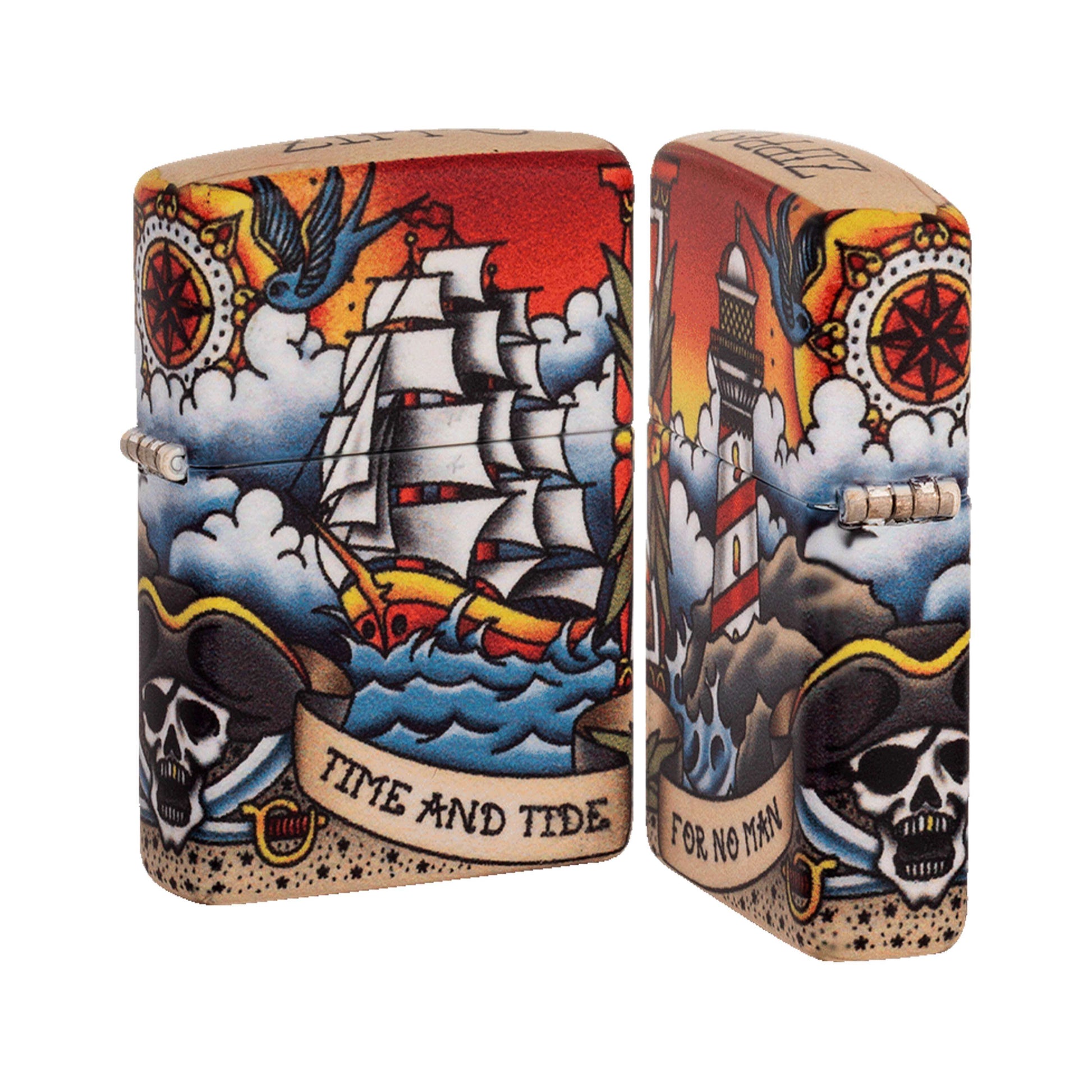 "Time and tide wait for no man" - Find this iconic quote in a script that wraps around this classic Nautical Tattoo Design lighter. Whether you're a fan of the American traditional tattoo style or the open sea-inspired design, this design is bound to bring you back to a time of vintage tattoo parlors. This design uses Zippo's 540 Color process, which allows for complete coverage of the lighter’s surface with precision artwork. Throughout this design are nautical-inspired elements such as the clipper ship sailing on the front and the lighthouse shining on the back. Comes packaged in a gift box. For optimum performance, fill with Zippo lighter fuel.